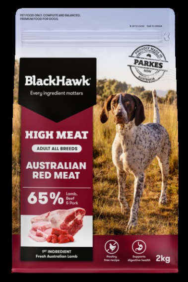 Black Hawk High Meat Australian Red Meat is a premium, high-protein diet designed to echo the natural prey diet of dogs' wild ancestors. Featuring 65% fresh Australian lamb, as well as beef and pork, this complete and balanced recipe provides high-quality protein for strong bones and muscles. 100% free from poultry ingredients, for those dogs that may have a sensitivity to poultry or prefer the flavour of red meats.