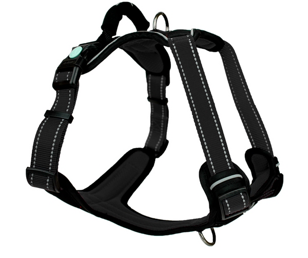 Our best-selling Ultimate Harness has been designed for safe and secure control of your dog. The harness features dual lead attachment points - one at the chest for training and extra control and one on the rear for everyday use. A well-placed padded handle is easy to grab for extra control. On the inside there is comfort padding and the neck and girth are adjustable to suit dogs of all shapes and sizes. Reflective stitching and a safety lock buckle makes this the Ultimate in harnesses and is a favourite of professional trainers.